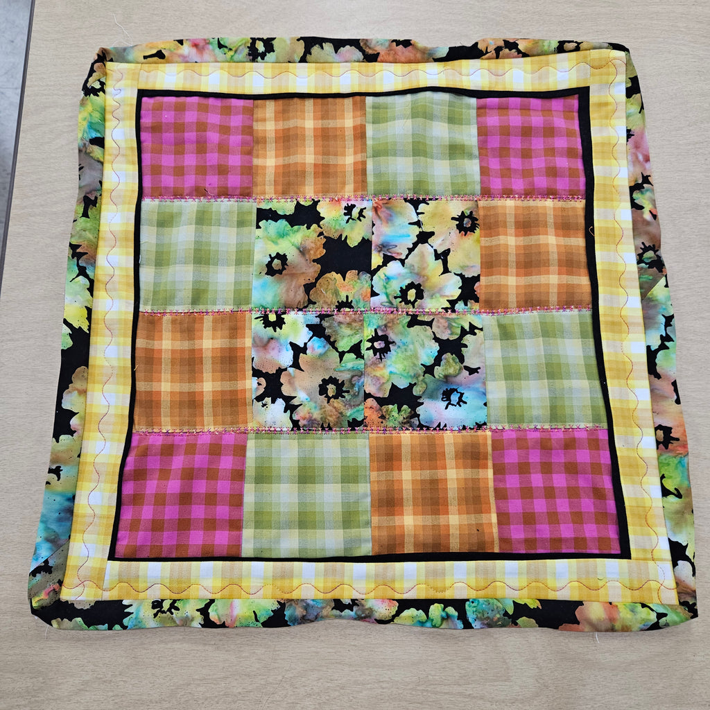 Make a beautiful wall hanging or table topper while learning all the basic steps of quilting in one manageable project, finishing at approximately 16" square. Students will learn to cut fabric using a rotary cutter and mat, piece the fabric together using a sewing machine, make a quilt sandwich, quilt and bind the quilt.