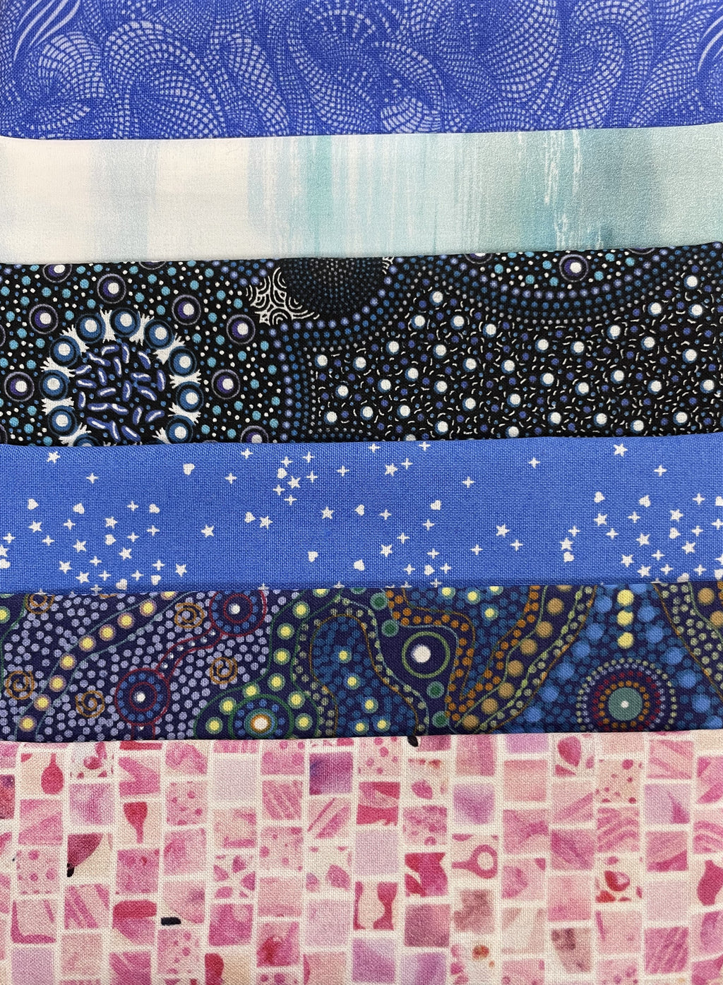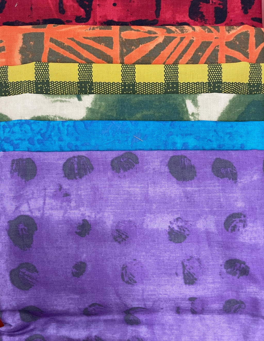 Each month for 6 months or more we will send 6 pieces of fabric and a spool of coordinating Presencia thread to you! Themes will vary, ranging in color, fabric line country of origin, etc. We carefully select the fabric, and all members receive the same fabric each month. The Silk Road Textiles Six-Pack Sampler is a great opportunity to stretch your creativity, try something new, and experiment with a wide variety of fabric designs. Check out the pictures for some examples of past 6-pack samplers.